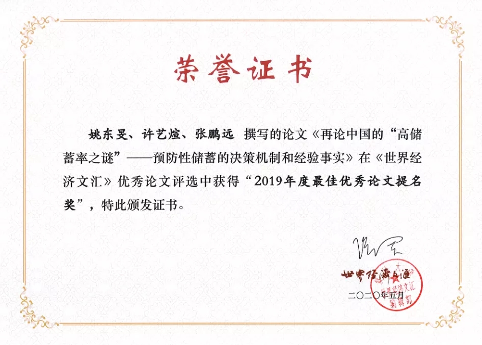 为了鼓励优秀经济学家,特别是年轻经济学家在本刊发表规范、严谨、求实的经济学论文,同时为了吸引优质稿源、提升期刊文章质量,从2018年起本刊启动了“年度优秀论文”的评选活动。每年年初编辑部从前一年刊登的所有文章中遴选出若干篇,由评奖委员会对遴选出的文章进行公平公正地投票,评选出一篇 “年度最佳优秀论文奖”和两篇 “年度最佳优秀论文提名奖”,给优秀论文获得者颁发证书。