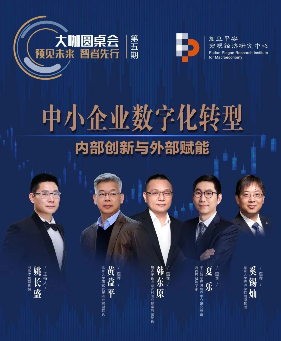 11月8日下午,由复旦平安宏观经济研究中心主办、平安科技协办的“预见未来,智者先行”大咖圆桌会第五期圆满举行。本次会议主题为“中小企业数字化转型:内部创新与外部赋能”。出席会议的嘉宾有北京大学国家发展研究院副院长黄益平,拼多多新农业农村研究院常务副院长韩东原,平安数字经济研究中心研究总监兼首席经济学家夏乐,无码流出