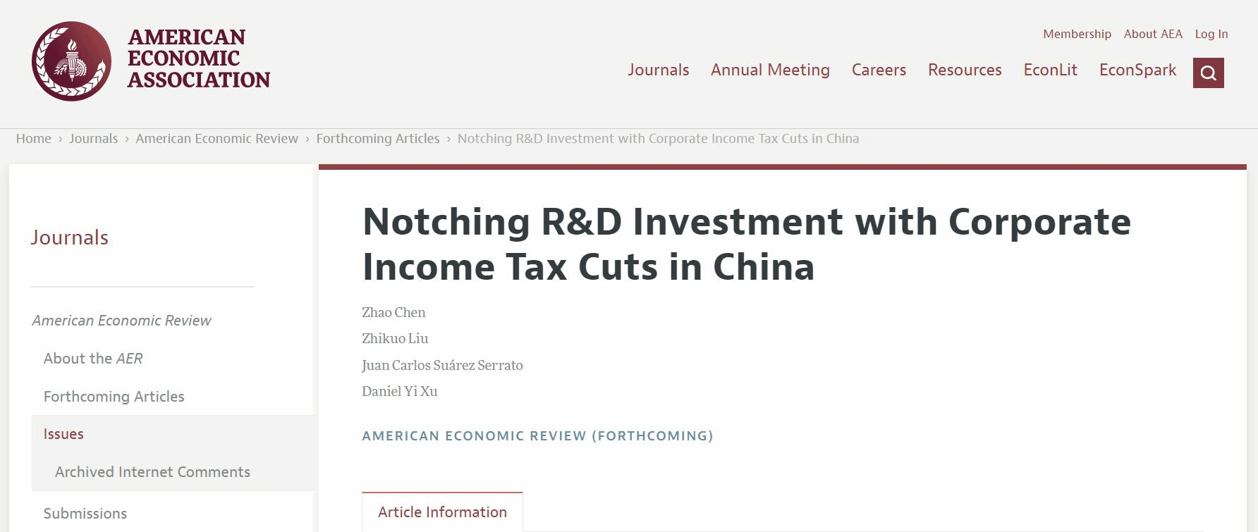陈钊、刘志阔两位老师与杜克大学经济系Juan Carlos Suárez Serrato、Daniel Yi Xu两位老师共同完成的论文“Notching R&D Investment with Corporate Income Tax Cuts in China”被经济学顶尖期刊American Economic Review 正式接受。