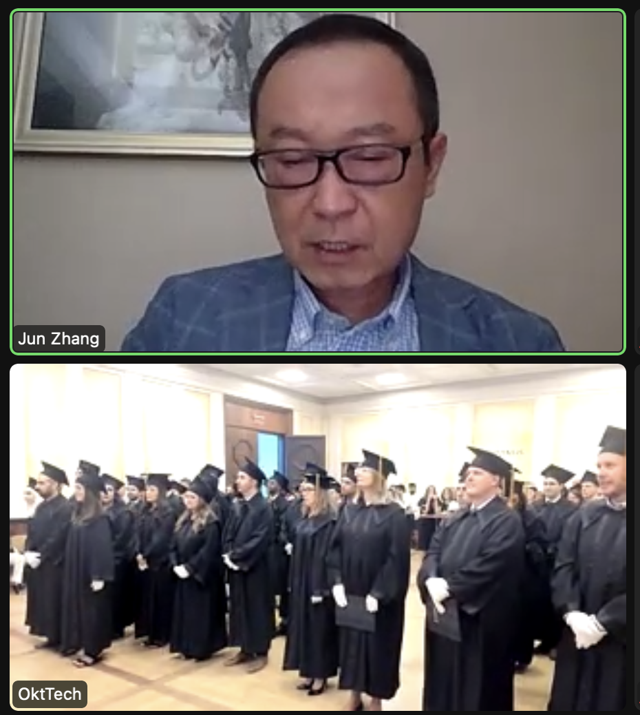 张军教授通过视频连线的方式发表毕业典礼致辞并向毕业生们送去祝福和问候。他指出,复旦-考文纽斯MBA项目旨在响应“一带一路”倡议,推进“17+1”合作,着眼高端金融人才培育,通过提供关于中国经济、金融、宏观经济政策和商业等相关的硕士课程,帮助深入学习中国的经济发展情况,促进双方的交流和理解。该项目自开办至今,在众多知名学者、教授及项目负责人的努力下,取得了显著的成就。近两年来,疫情不仅限制了我们的出行,也给中国及世界其他国家的经济带来了巨大影响,但这并没有阻隔两国间的合作。该项目的学生在艰难的环境下仍然坚持不懈地进行学术研究与交流,这对当今世界的发展有着举足轻重的作用。同时,他向匈牙利央行、考文纽斯大学商学院及项目团队表达了诚挚的谢意。此外,他也对学生不能来上海学习表示遗憾,并期待早日能与学生们进行面对面的交流。