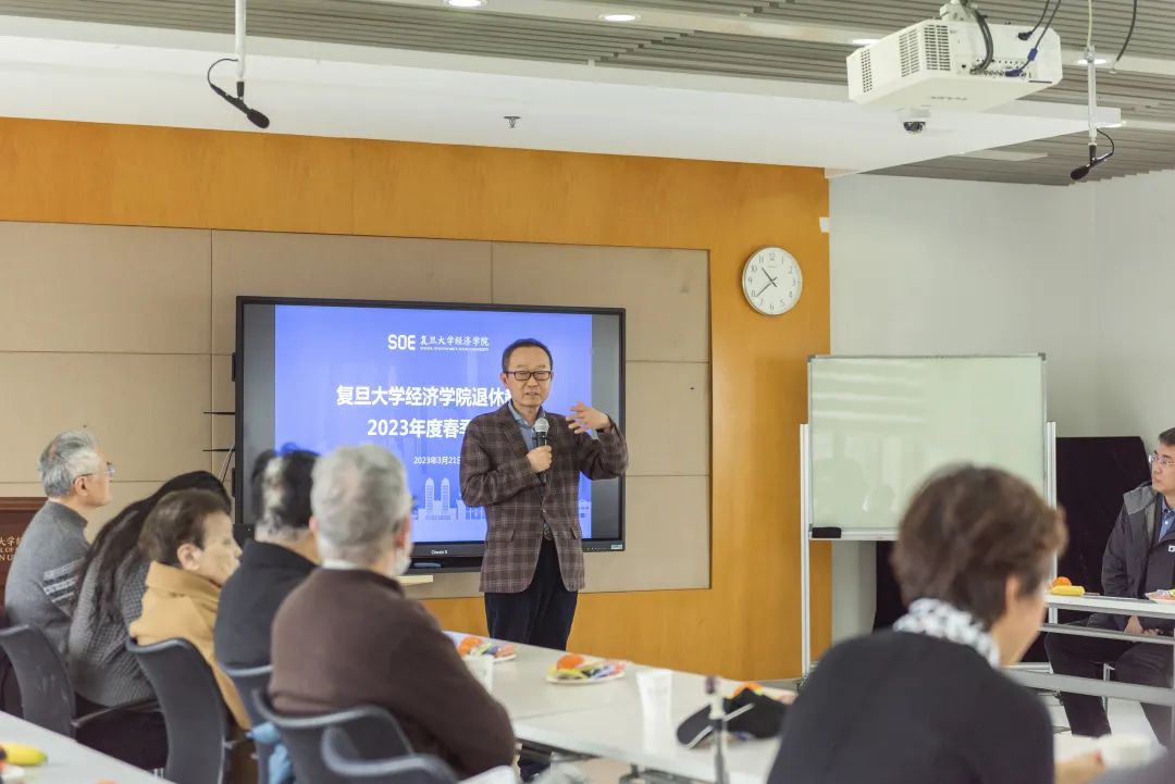 党委副书记李志青等出席并分别致辞。年近九旬的洪远朋、周建平、王克忠、尹伯成等教授和其他退休教师共40余位欢聚一堂。老师们久别重逢,格外亲切。现场讨论气氛热烈,大家其乐融融,共话时事。