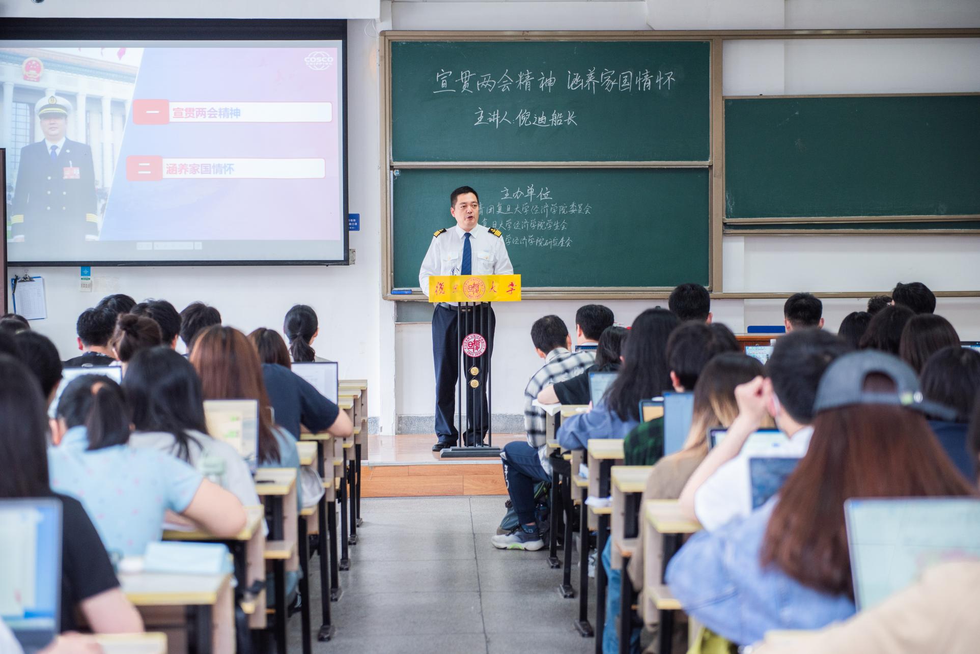 倪迪船长首先为经院师生介绍了第十四届全国人大一次会议的概况,总结了会议的主要精神和重要成果。在大会期间,习近平总书记发表的一系列重要讲话,为全党全国人民奋进新征程、建功新时代提供了指引和遵循。