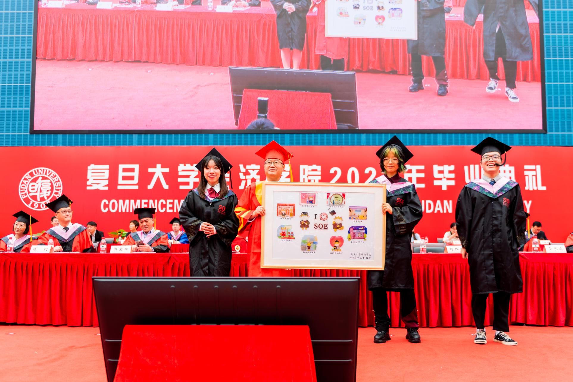 学位授予仪式后,2023届经济学系本科生应启翔、杜然,国际金融系本科生施怡辰三位同学作为毕业生代表向学院赠送了毕业礼物——“定格青春记忆”经小牛系列手绘图集。该系列以经小牛作为主角绘制了毕业生印象深刻的八个场景,用画笔将青春时光定格,将经院人的专属记忆留档,以此感谢学院一直以来的教导和栽培。