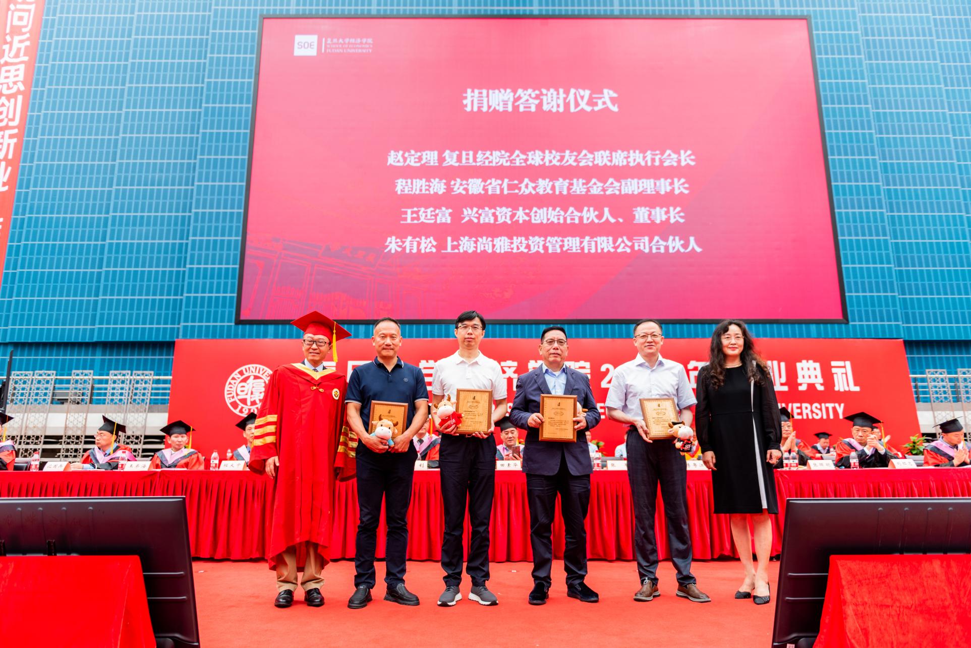 全球校友会联席执行会长赵定理,安徽省仁众教育基金会副理事长程胜海,兴富资本创始合伙人、董事长王廷富,以及上海尚雅投资管理有限公司合伙人朱有松等校友代表颁发捐赠纪念牌,对他们表示诚挚的感谢。