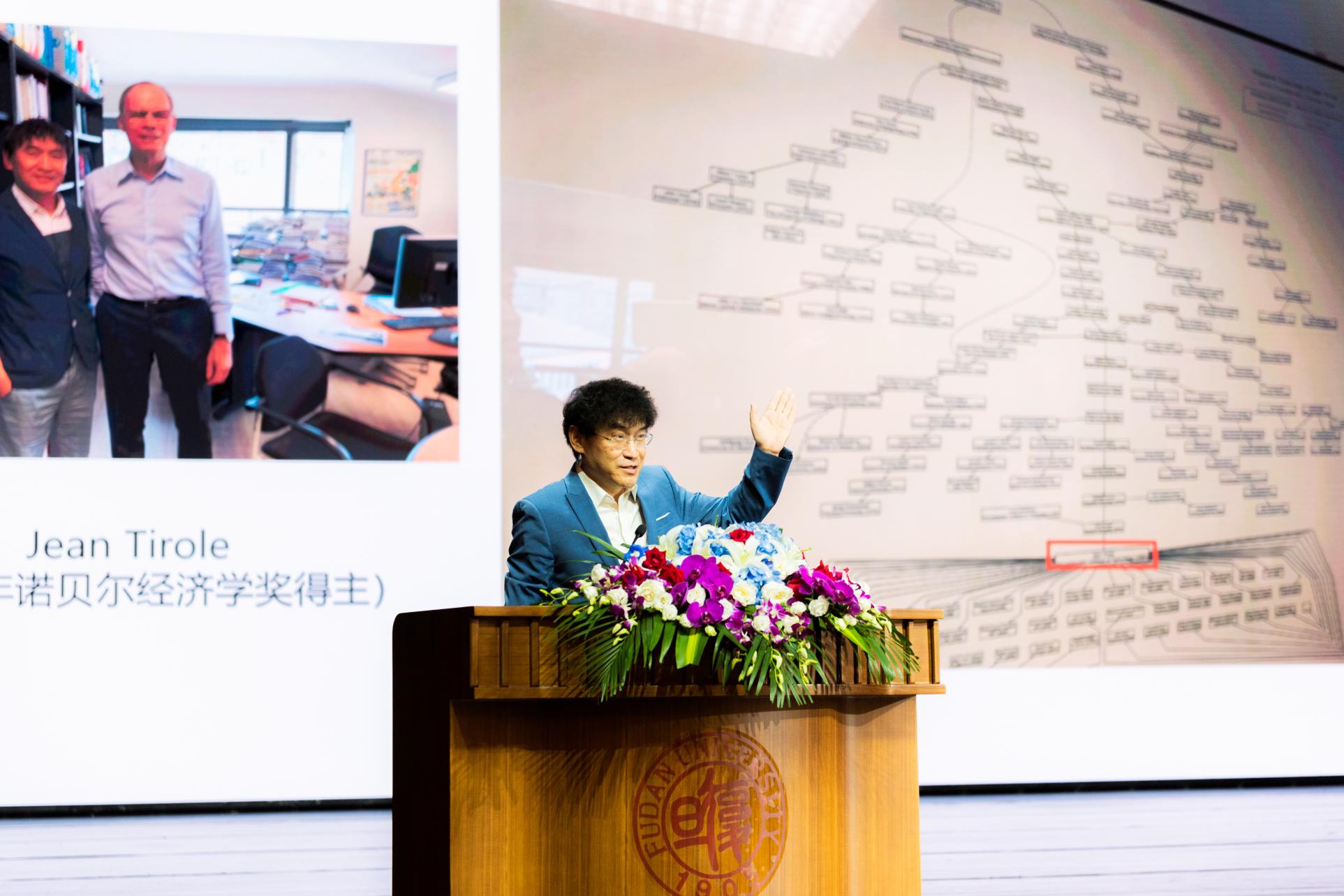 2018年我去法国拜访Tirole,我都忘了聊过什么,但是在走出他办公室的门口,我看到一张图,顿时惊呆了。这张图是Tirole的学术族谱,其中的一个小框就是他自己,往上看,他的老师是哈佛大学的Eric Maskin,也是一个诺贝尔经济学奖得主,他今年6月份还来杭州参加罗汉堂的年会。
