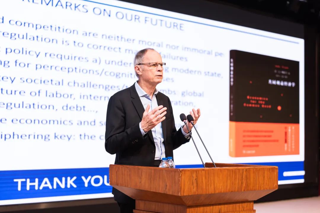 最后,梯若尔教授总结道:市场与竞争本身无所谓是否道德,政府监管的职责是纠正市场失灵,良好的公共政策需要理解现代国家的内涵以及考虑到人们认知上的偏差。在面对如全球变暖、劳动力市场的未来、不平等等问题时,应使用经济学与社会科学的分析方法,并以共同利益作为关键的切入点。