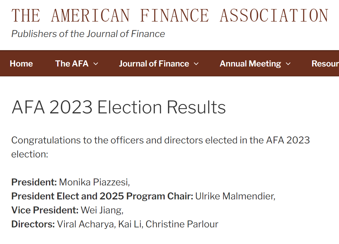 美国时间11月29日,姜纬教授获得美国金融学会(the American Finance Association, AFA)提名委员会提名,然后通过全体会员差额选举投票赢得2024年副主席职位,并将于2025年成为入选主席,2026年成为AFA主席。AFA主席为金融学界最高学术职位。姜纬将是担任此职的第一位中国人和第二位亚裔学者。多位曾经担任此职位的知名学者获得诺贝尔经济学奖。祝贺姜纬校友!