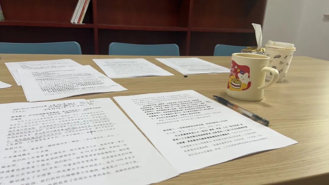 辅导员赵晓惠商量着挤出时间一起“划重点”,碰撞灵感。决赛前两天,她们相约文科楼会议室,一起讨论理论宣讲要点,整理宣讲思路,互相提问理论出处。