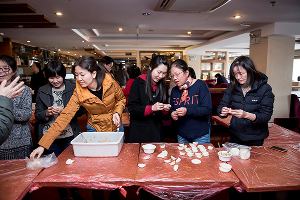 在上岛咖啡馆组织了女教师们“你会我学,大家一起来”的包饺子、摆果盘暖心活动。