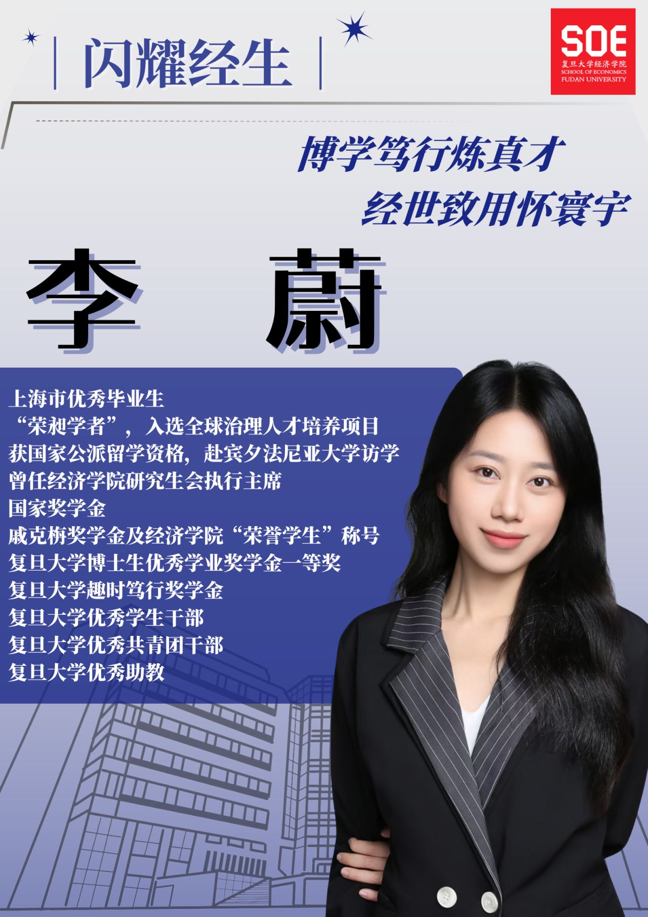 2015级本科生、2019级政治经济学专业硕博连读生。十年经院路,她步步拓展成长维度。不仅学业成绩优异,学术上亦持续深耕,研究聚焦中国特色经济实践,并拓展国际视野,赴宾夕法尼亚大学访学交流。她曾任研究生会主席、班级班长;入选“荣昶学者”,参与国际劳工组织全球治理训练营;也活跃于各类舞台,展现卓越表达力。获上海市优秀毕业生、国家奖学金、博士学业奖学金一等奖、复旦优秀学生干部、无码流出