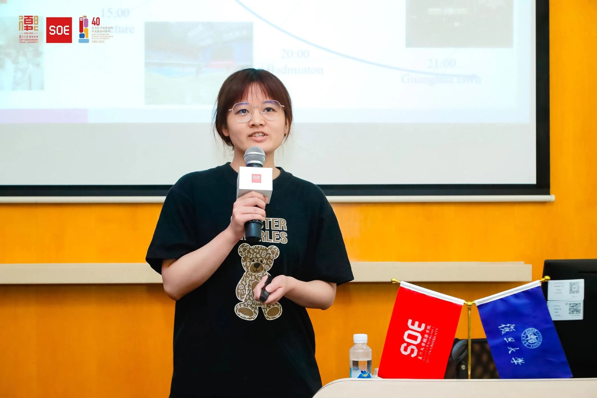 接着,助教金佳琦从学姐角度出发,向学员们分享了自己在复旦的学习与生活体悟。详尽介绍了复旦的校园环境、食堂特色、学习资源和多彩活动,生动展现了百廿复旦的人文底蕴与独特魅力。项目组老师详细阐述了本次夏令营的活动概况与日程规划。
