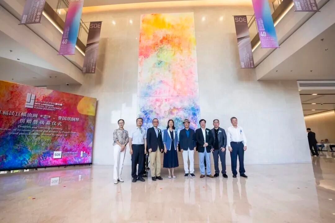 在副院长詹璐的倒计时声中与现场观众的见证下,许征、张军、李粤江、卓福民、曹国琪和经院校友会会长赵定理、汪新芽、杨德红为油画《恋》揭幕。色彩鲜艳的抽象画正式亮相,观感上的震撼让在座观众纷纷拿起手机记录下这一刻。