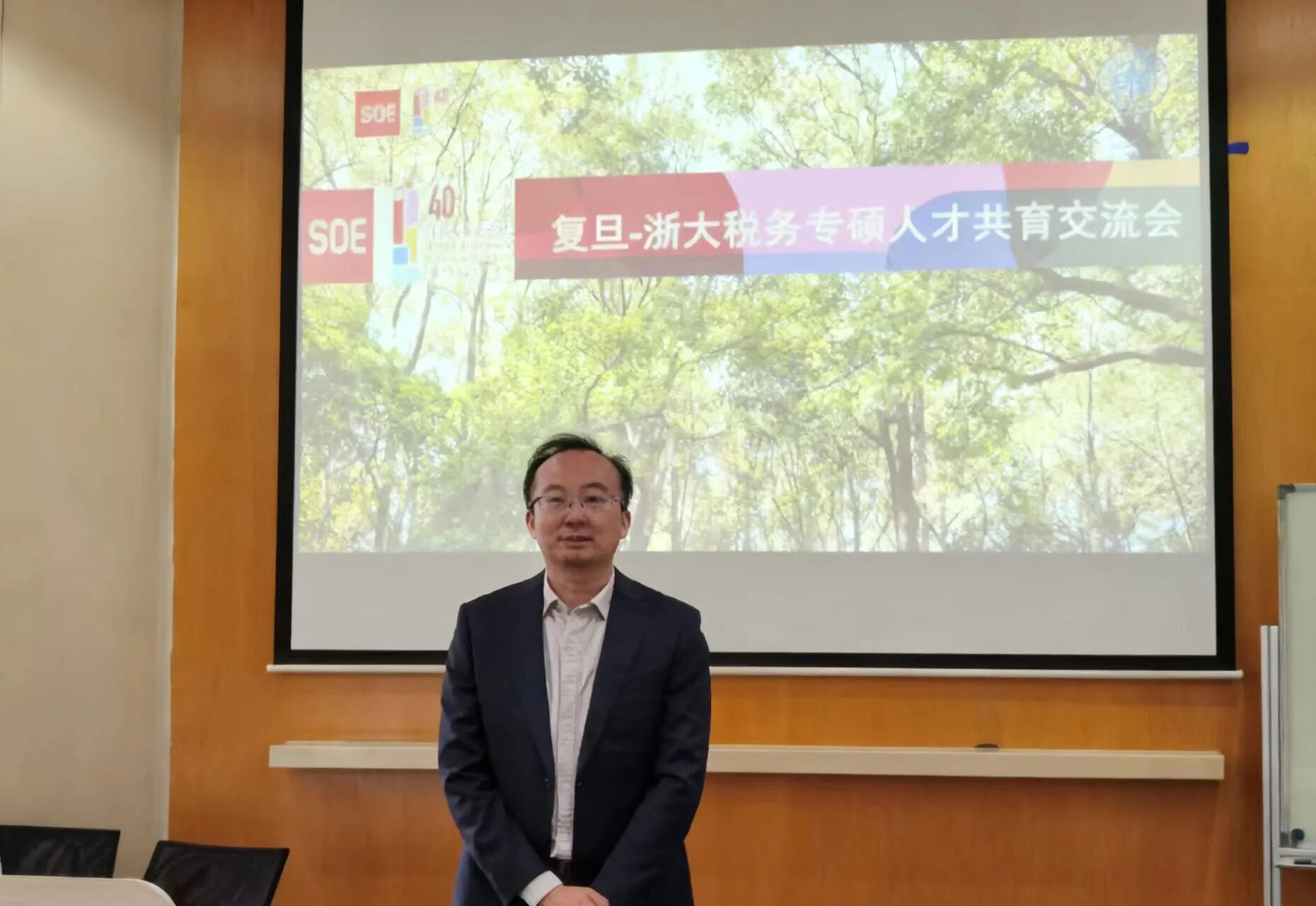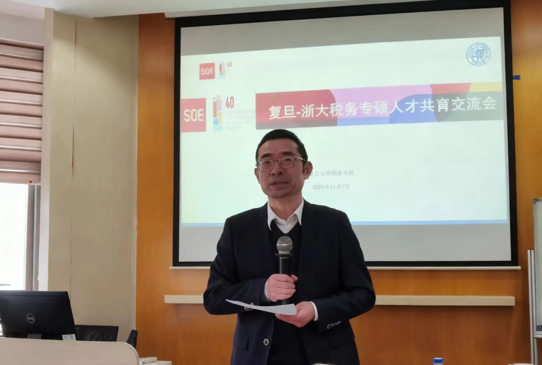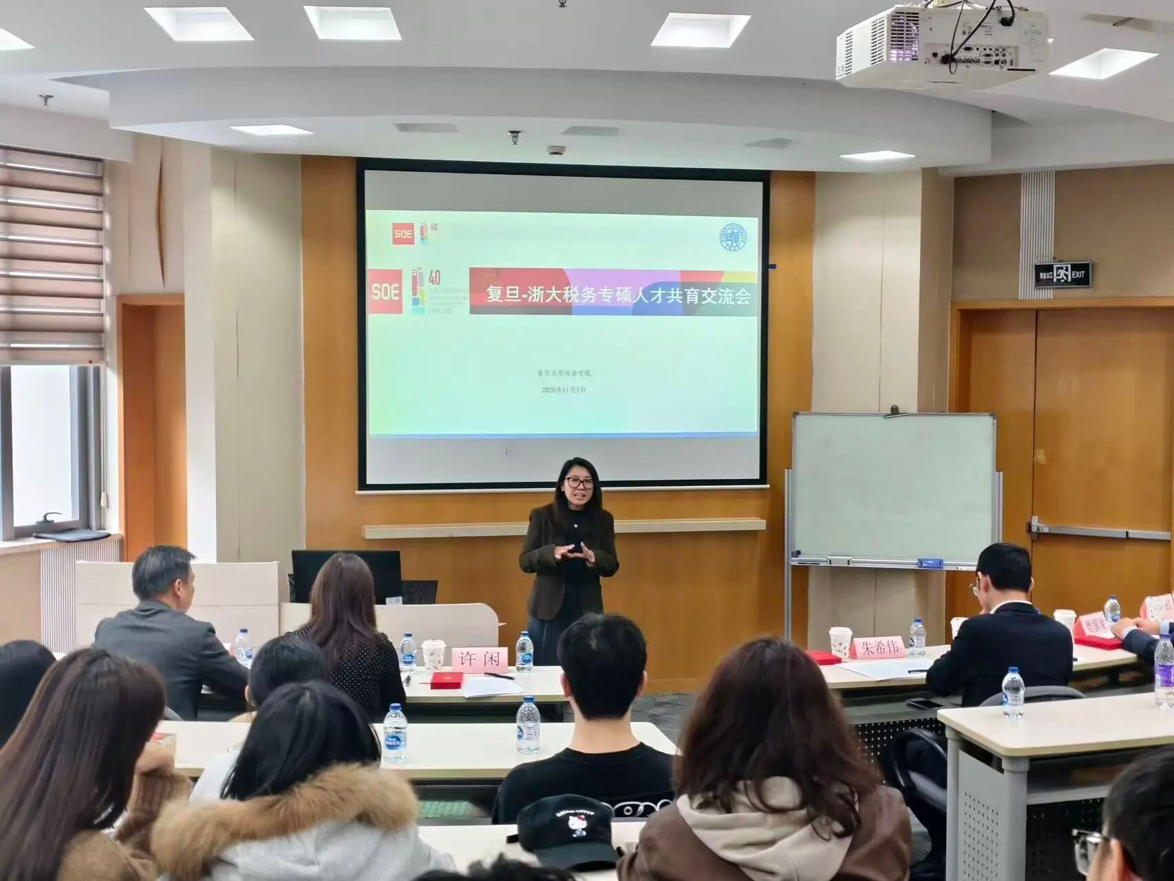 税务专硕项目学术负责人杜莉教授对浙江大学师生的来访表示热烈欢迎。她首先分享了复旦税务专硕在课程建设、人才培养和数字化教学方面的特色与探索,同时对浙江大学税务专硕在校企合作深化、人才培养成效等方面取得的进步表示赞赏。杜教授还表示,期待未来能带领复旦学生赴浙江大学开展回访交流,持续深化两校税务专硕项目的互动合作。