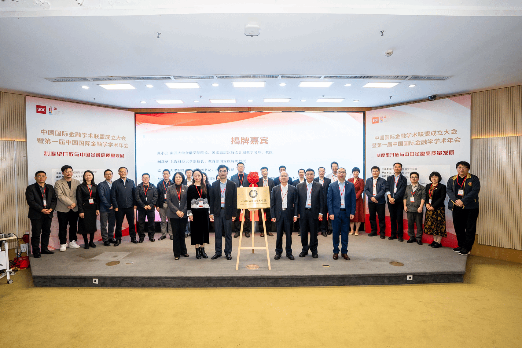揭牌仪式环节由南开大学金融学院院长范小云、上海财经大学副校长刘莉亚、天津财经大学校长孟昊、山东财经大学副校长彭红枫、湖南大学原副校长杨胜刚、厦门大学特聘教授朱孟楠作为揭牌嘉宾,与22位联盟理事单位代表及支持期刊代表共同见证这一国际金融学术领域的重要时刻。