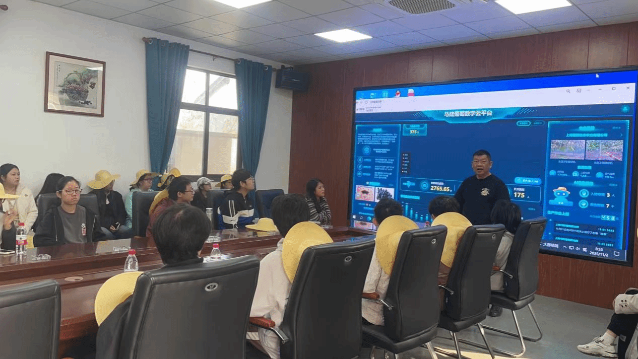此外,科技在农业应用中的重要性日益凸显,已成为驱动现代农业发展的核心引擎。在马陆葡萄园中,合作社社长孙杰先生亲自为同学们上了一堂生动的“智慧农业”课,他向同学们系统演示了如何通过数字化与规模化的手段赋能现代农事作业,该智能系统不仅能够动态监控葡萄种植、采摘、包装全流程,还实现了对葡萄品质与土壤作用的精准溯源,有效保证了生产过程的可靠性及透明度,这充分表明大数据、物联网等技术正逐步重塑传统农业的生产模式和管理效率。