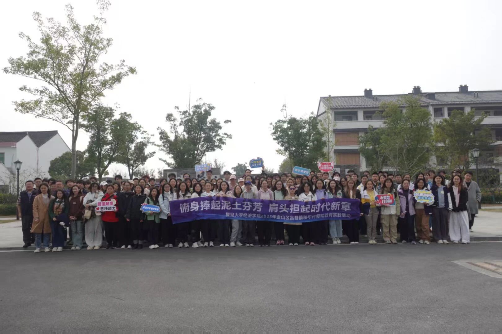 领导和各系所中心的大力支持下,在本科办、学工组和各班辅导员的精心组织安排下,2024级近300名本科生以班级为单位分别前往金山区吕巷镇和平村、宝山区月浦镇片区三村、嘉定区马陆镇大裕村等地进行走访调研和劳动实践。李楠、王殿志、朱宏飞三位带教老师以及2024级辅导员张宁馨、罗诗韵、李俊杰、高铭泽老师带队全程参加了两天的活动。