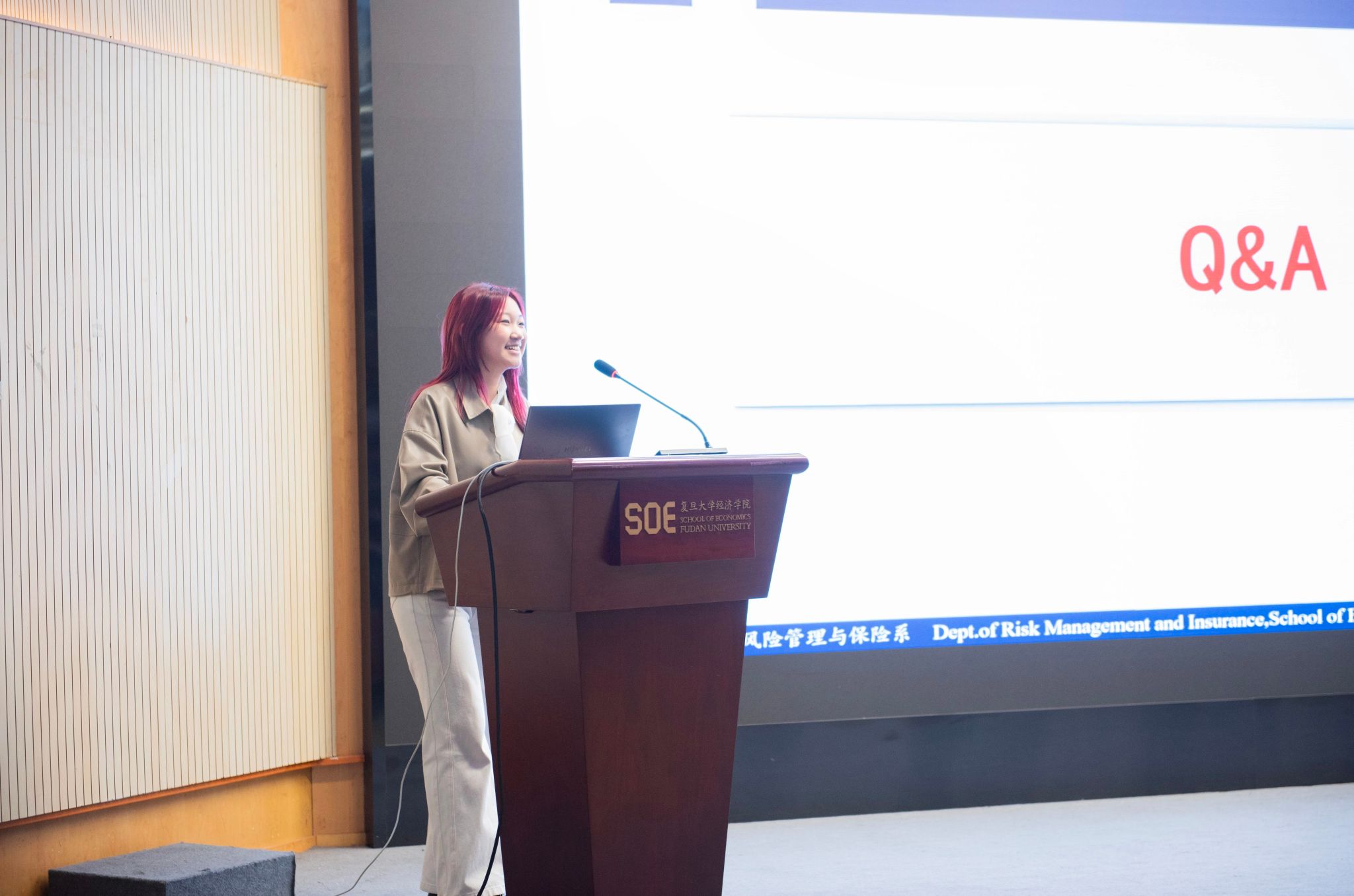 此外,她还盘点了助力学生的资源宝库和往届学生的发展路径。从国泰奖学金、善诊奖学金到覆盖全体本科新生的系设奖学金,再到IFoA“未来精算师”奖助学金;以及国内各类硕士博士项目、Fudan-Ulm双学位硕士项目、Fudan-Ulm 3+1+1本硕直通车项目、复旦-港中文金融科技1+1项目、加拿大滑铁卢大学精算硕士等多元升学通道,让求学之路无后顾之忧。过去5届毕业深造率接近80%。从历届就业去向看,学界有20余名学生进入清华、北京、复旦,以及宾大沃顿商学院、欧洲工商管理学院、康奈尔大学、新加坡国立大学、乌尔姆大学等国内外高校攻读经济学、金融学、精算学、统计学、管理科学与工程、市场营销等专业博士学位;已有多名博士毕业生进入川大经院、加州大学洛杉矶分校安德森管理学院、法国EDHEC商学院气候研究所、新加坡国立大学公共卫生学院担任教职或从事研究岗工作。业界以太平洋、太平、友邦、众安等保险公司总部及慕尼黑再保险总部等全球再保险公司,中债登、银行、保险资产管理公司等金融机构,阿里巴巴、腾讯、字节跳动、美团等互联网公司,战略咨询公司为主。最后,她期待感兴趣的同学加入保险学专业,保险学专业将全力守护同学们的美好未来!