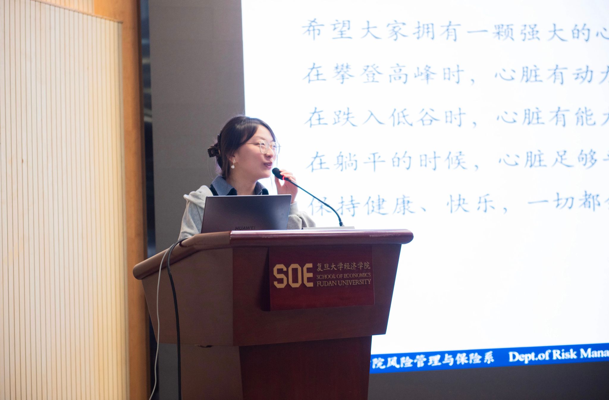 风险管理与保险学系优秀青年教师代表丁晖老师以“在不确定中设计确定:保险学研究的逻辑与温度”为题进行学术分享。如果说课程是骨架,那么学术便是灵魂。丁晖老师从研究者的视角,带领同学们触摸保险学潜藏在冰冷公式背后的温度。世界充满无常,面对命运的掷骰子,保险学能做些什么?丁老师给出了极具力量的回答:在不确定的世界里,寻找确定性的规律;以数理之锚,驯服随机之浪。丁老师以大数法则阐释了个体的随机厄运如何通过群体的互助机制得以化解;以精算定价解析了如何用严谨的数学为不确定性标价,维系市场的生生不息。她引用前沿文献,为同学们揭开保险研究的神秘一角,告诉我们保险学即是以制度之善,抚慰人性之忧,最终落脚点是“人”。