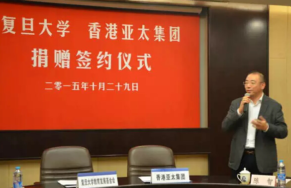 随后,香港亚太集团总裁陈智校友致辞。他表示,香港亚太集团是一个多元化企业集团,在专注自身发展的同时,集团也始终牢记服务社会的责任与使命,一直以来积极参与各类公益活动,尤其是在促进教育发展,关爱青年成长方面投入了极大地心血和力量。同时,作为复旦培养的学生,复旦亚太教育发展基金的设立也体现了他自身对复旦的热爱和饮水思源之情。他也希望基金能为广大学子提供物质和精神动力,并且在母校产生广泛而持久的影响。