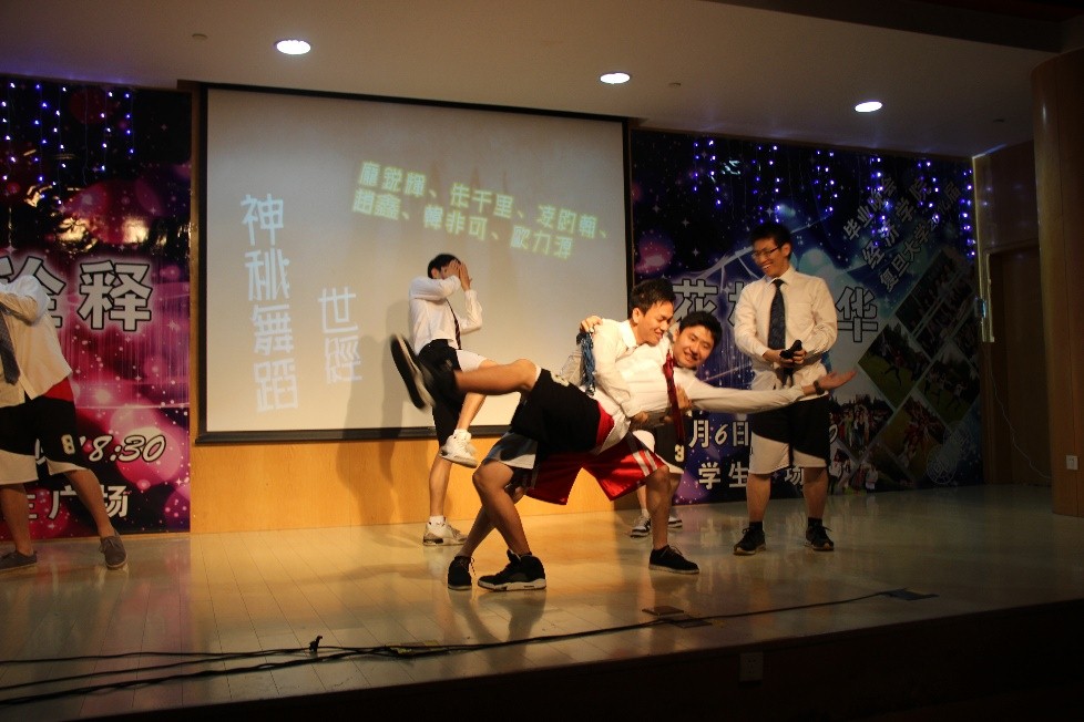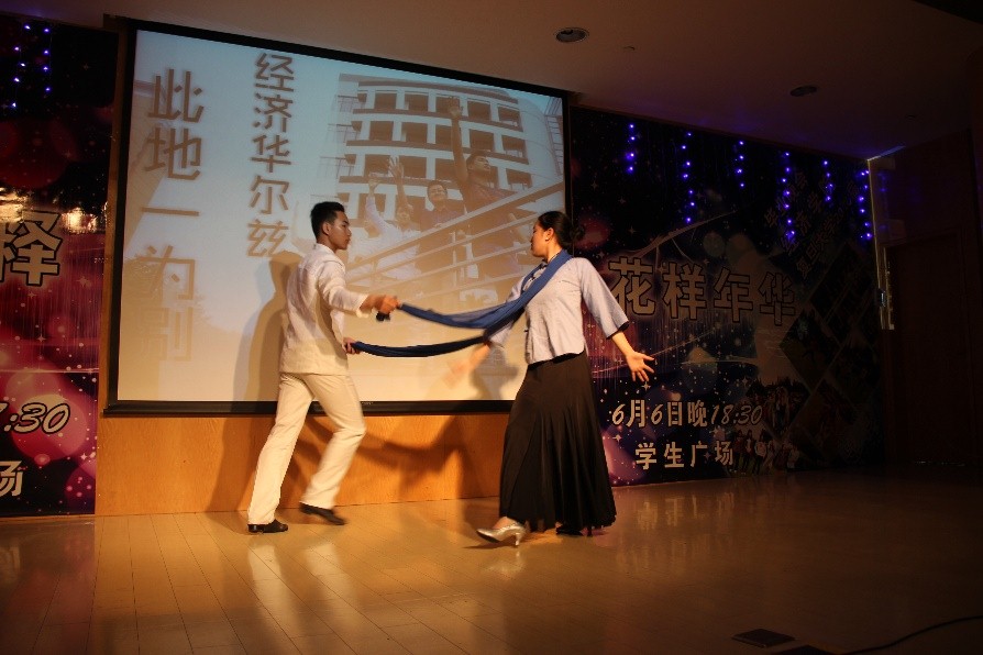 整场晚会的班级表演节目开场是经济系班级合唱原创歌曲《光草的天空》,人才辈出的经院不仅有能说会唱的表演者,还有才华横溢的谱曲者和填词人,歌词中多次提到光华楼、经院、复旦等大家熟悉的元素,正是这些复旦的每一个角落充满了大家酸甜苦辣的回忆啊,而哀而不伤的悠扬曲调则更是为毕业生们的青春做出了最好的注脚。正当大家还沉浸在10经小济们的合唱之中时,国际金融系的姑娘们开始了《Oh & Baby’s on fire》的热舞表演,精彩的表演和动感的歌声将晚会拉向了第一个小高潮,精心的排练和编舞使得这个节目成为了对在场每一个人的一场视觉盛宴,大家不由自主地随着富有节奏的的歌声沉浸其中,情绪也得到了最佳的调动。紧接着,经济系又派出两位进行《你最珍贵》的深情对唱,两位男女同学唱到情深处,牵起了对方的手深情对望,青春虽逝,情谊永存,在场的观众都被他们精湛的表演所深深打动。