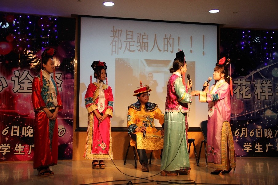 晚会的高潮在财政系的话剧《甄嬛闹晚会》时到来,“嬛嬛”一上场提起了毕业论文的梗瞬间就带动了全场气氛。男扮女装的“安小主”操着一口方言,踩着拖鞋,穿着短裤就上台了,引得大家忍俊不禁。随后的“华妃”、“皇帝”等演员的精彩表演,更是逗乐了所有人。 “皇帝”的一句“怎么没有人侍寝呢?”配上他上挑的眉毛,更是演的入木三分。最后,全体演员们给在场观众“请安”祝福,使得全场掌声雷动,气氛热闹非常。