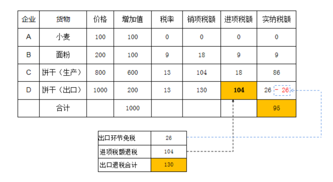 图1展示了一个简化的例子,其中D企业购进C企业生产的饼干并出口,进货货值为800万元,出口货值为1000万元,在饼干的增值税名义税率和出口退税率均为13%时,将发生增值税进项税额104万元,出口环节增值税免税26万元,进项税额退税104万元,出口退税总额(出口免税加进项税额退还)130万元。形式上,该企业的进项税额完全得到了退还。然而,考虑到饼干的出口货值至少包括小麦销售、面粉加工销售、饼干生产销售、饼干出口四个环节的增加值,根据销售小麦可免增值税、销售面粉可适用9%的低税率、购进小麦可抵扣收购金额的9%等政策计算前三个环节的A、B、C企业的应纳增值税额后,可得到该出口货物的国内实纳增值税额之和是95万元,而不是D企业取得的进项发票上反映的104万元,于是,从国家总体而不是单个出口企业角度看,就将产生9万元的超额退税。
