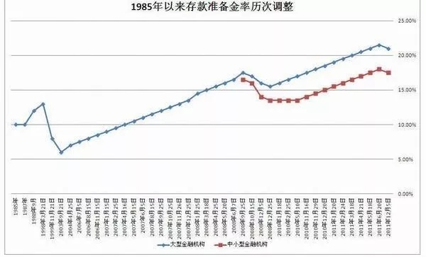 过去30多年中国多次调整法定准备金比率来管理宏观经济是这种权衡关系的直接反映,包括:1987-1989年两次向上调整到13%、1998年3月-1999年11月两次向下调整到6%、2003年9月-2008年6月21次向上调整到17.5%、2008年9月-2008年12月四次向下调整到15.5%、2010年1月-2011年6月12次向上调整到21.5%、2011年12月-2016年2月12次向下调整到16.50%。也就是说,从1987年到2017年,中国调整法定准备金比率要求共计有53次。
