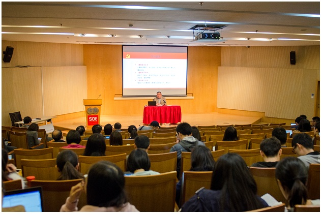 陈诗一教授从十九大报告的篇章结构和布局谋篇切入,详细阐释报告的主要内容、精神实质和重要意义,带领党员们原汁原味地学习领会报告的精髓。他指出学习十九大报告可以分为三部分:第一部分总结了过去五年的工作,论述了取得历史性成就和发生历史性变革的原因,做出了中国特色社会主义进入新时代的重大政治判断;第二部分重点是习近平新时代中国特色社会主义思想的形成过程、基本内涵和历史地位,明确回答了在新时代坚持和发展什么样的中国特色社会主义、怎样坚持和发展中国特色社会主义这两个基本问题;第三部分深刻阐述经济、政治、文化、社会、生态“五位一体”的相关论述和实践要求,同时也对国防和军队建设、“一国两制”和祖国统一、外交做了详细阐述,尤其是着重阐述了报告关于全面从严治党,不断提高党的执政能力和领导水平的论述。随后陈诗一指出,十九大报告,高举旗帜,鼓舞人心,把握大势,与时俱进,求真务实,总结了党和国家事业发生的历史性变革,明确了新时代中国共产党的历史使命,提出了我国发展新的历史方位,阐述了新时代中国特色社会主义思想和基本方略,作出了新时代党和国家事业发展的战略部署,是一个发扬民主、集中全党智慧、凝聚各方共识的好报告。我们必须坚定服从和拥护党中央的战略部署,把对党忠诚、为党尽职、为师生谋福利作为根本政治担当,不忘初心、牢记使命,把十九大确定的宏伟蓝图和各项任务作为我们的行动指南。