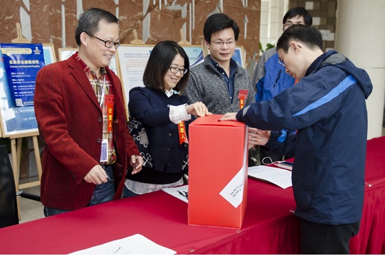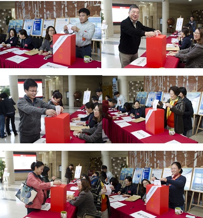 一楼大厅堂隆重开启。投票站开启仪式由学院党委书记石磊老师主持,石老师同时宣布党委副书记尹晨老师为总监票人,张琼、王建平、张毅、何立民等6人分别为监票人、计票人和发票人。