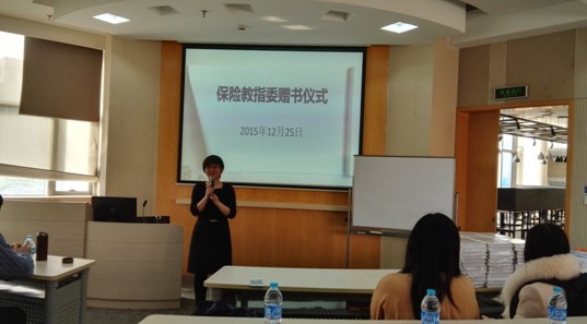 接下来,陈冬梅老师组织教师代表向同学们赠书。除了保险教指委的赠书,中德安联人寿保险公司向同学们赠送了公司发行的英文杂志。同学们接过老师所赠书籍并表达了深深的感激之情。赠书活动在欢快的气氛中进行,活动最后,全体出席的教师及学生进行了合影留念。