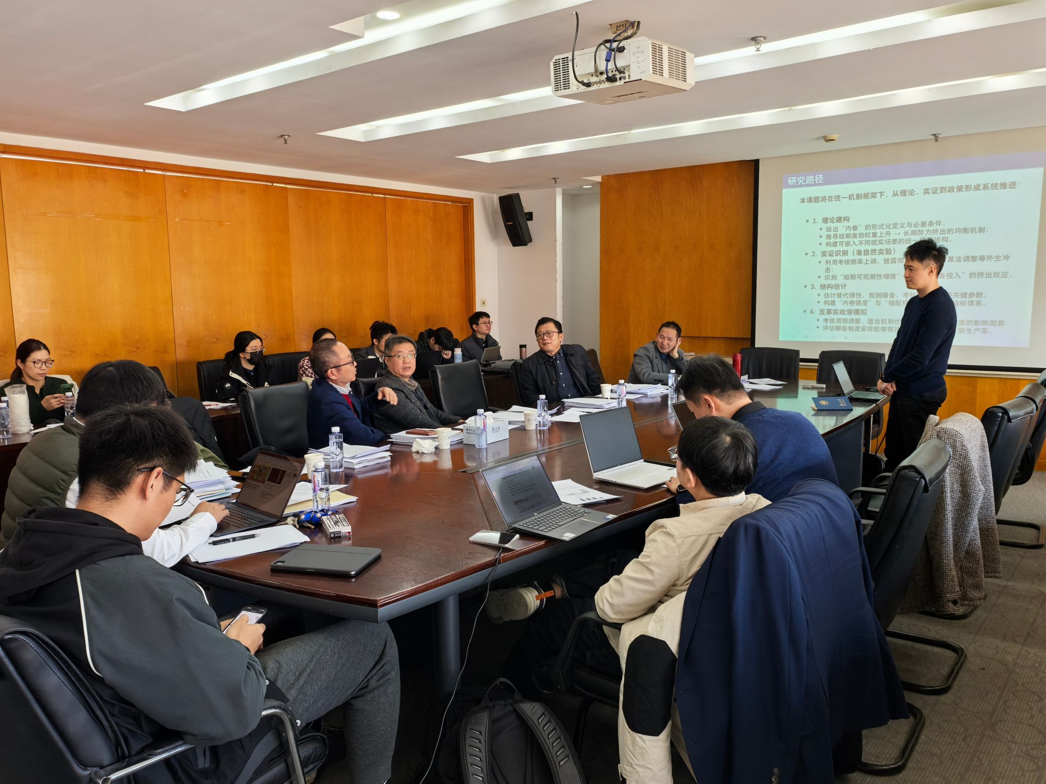 汇报会通过了朱虹、丁靖煊、方梦婷、郭维超、赵文天、唐浩、王书飞和陈德仙博士关于《从冲击到韧性:贸易政策不确定性与企业创新质量》、《信任在家庭保险决策中的作用》、《中国制造业技术赶超:困境与破局》、《可观测性结构、竞争压力与内卷:多维特性的微观基础》、《从靶点到药物:知识产权制度如何影响中国医药创新链条》、《清代司法能力与国家治理绩效》、《中美经贸摩擦对日本跨国公司全球价值链的影响研究》、《地权结构、土地投资与农业生产效率:基于近代中国农户数据的历史计量研究》的开题报告。