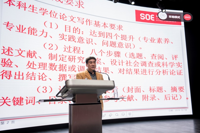 田素华教授介绍了本科生毕业论文必须具备的“8个要素”,即标题、摘要、关键词、目录、正文、参考文献、附录和后记,并对每个要素的注意事项和要点做了深入讲解,建议大家多听取导师意见、多与导师讨论,抓住细节,写出能体现复旦水平的本科生毕业论文。