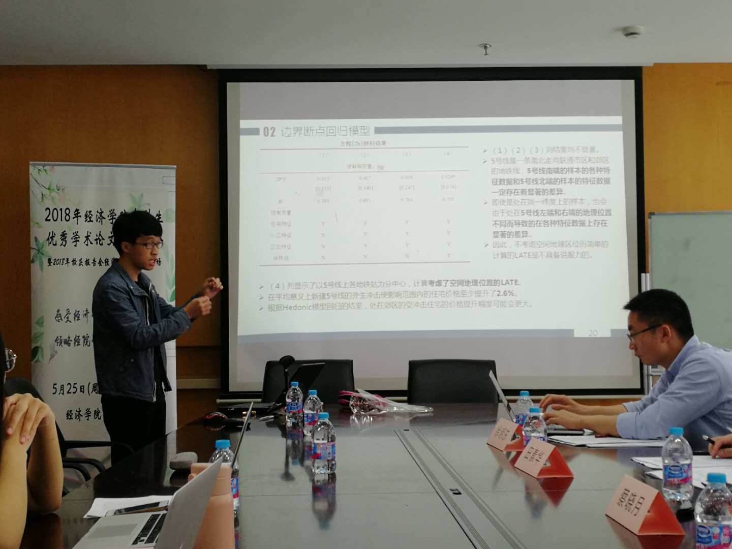 第二位进行展示的是苏浩同学和吴丹桐同学的《城市轨道交通的住宅溢价测算及形成机制分析——以北京地铁5号线为例》。首先,苏同学介绍了选题背景:2010-2016年城市数量与规模扩张迅速,轨道交通不断扩大,是研究城市扩张的新视角。之后,苏同学提供了城市化问题新视角——类随机实验方法,结合RD思想于DID方法,弥补现有文献只用Hedonic模型法的不足。他以北京七号线为数据研究对象,从链家网等各种二手房交易网获得价格与属性数据,得出:住宅到地铁站距离每减少100米,单位面积房价上升0.24%。蔡晓月老师对此提出疑问:如何剔除08年经济危机与房地产刺激政策的影响?苏同学表示已用DID模型剔除了时间因素的影响。