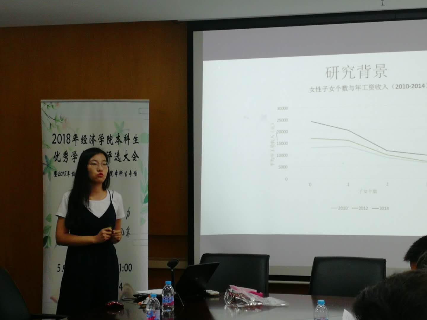 首先进行展示的是14级经济学吕思诺同学的《中国女性的生育工资惩罚——基于CFPS的实证研究》。吕同学首先介绍了她的研究背景:生育工资惩罚,即多生孩子导致工资降低的问题值得重视。之后,吕同学展示了她的实证策略和计量结果:使用2010-2014年三轮CFPS数据,利用个体固定效应回归模型,使难以观测的其他个人因素不引起偏差。她的研究结果表明:子女个数负面影响显著;只有生育二胎的女性可以因经验缓和惩罚;低技能女性受到的生育惩罚更大;在第二产业影响大于第三产业,在非公有制企业影响显著而公有制不显著。最后,吕同学提出了政策性建议:家庭生育成本社会化,规范劳动力市场,建设教育托儿设施。沈国兵老师指出没有把有段时间剔除,哺乳期/产假时间应剔除,不然人为压低工资;而田素华老师则在学术规范方面提出了自己的建议:论文排版要注意,可模仿正规文献格式。