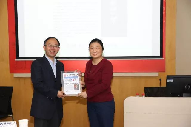 副院长刘军梅老师向裴奕根校友赠送纪念品。