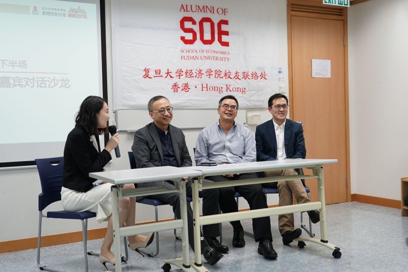 下半场,由经济系校友秦伟小姐主持嘉宾讨论环节。卢长祺先生,鲁育宗先生以及瑞银资产管理中国区的董事总经理施斌先生进行了精彩的对话,探讨了2016年资本市场投资策略,港股的走向,以及人民币汇率未来趋势,并和听众进行了精彩的互动交流。
