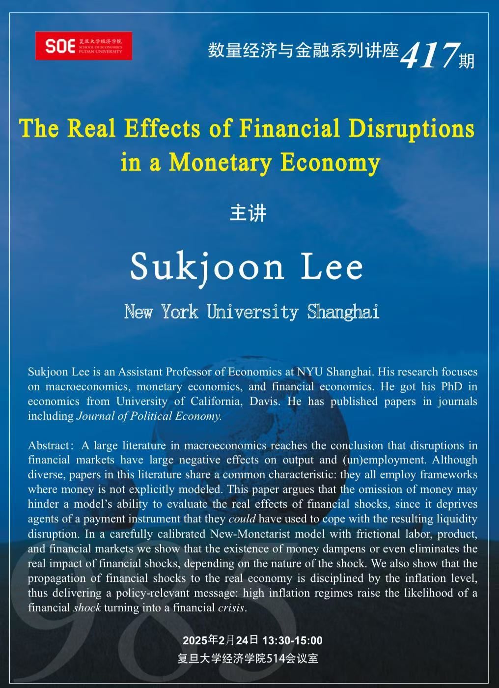 Sukjoon Lee is an Assistant Professor of Economics at NYU Shanghai. His research focuses on macroeconomics, monetary economics, and financial economics. He got his PhD in economics from Univeristy of California, Davis. He has publised papers in journals including Journal of Political Economy.