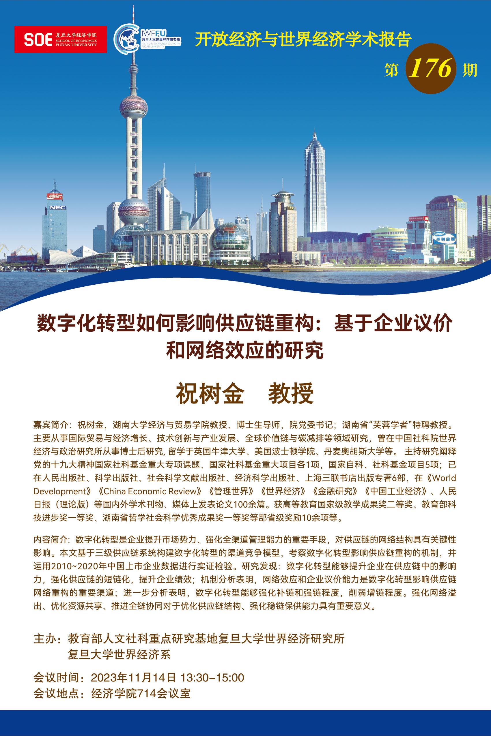 嘉宾简介: 祝树金,湖南大学经济与贸易学院教授、博士生导师,院党委书记;湖南省“芙蓉学者”特聘教授。主要从事国际贸易与经济增长、技术创新与产业发展、全球价值链与碳减排等领域研究,曾在中国社科院世界经济与政治研究所从事博士后研究, 留学于英国牛津大学、美国波士顿学院、丹麦奥胡斯大学等。 主持研究阐释党的十九大精神国家社科基金重大专项课题、国家社科基金重大项目各1项,国家自科、社科基金项目5项;已在人民出版社、科学出版社、社会科学文献出版社、经济科学出版社、上海三联书店出版专著6部,在《World Development》《China Economic Review》《管理世界》《世界经济》《金融研究》《中国工业经济》、人民日报(理论版)等国内外学术刊物、媒体上发表论文100余篇。获高等教育国家级教学成果奖二等奖、教育部科技进步奖一等奖、湖南省哲学社会科学优秀成果奖一等奖等部省级奖励10余项等。