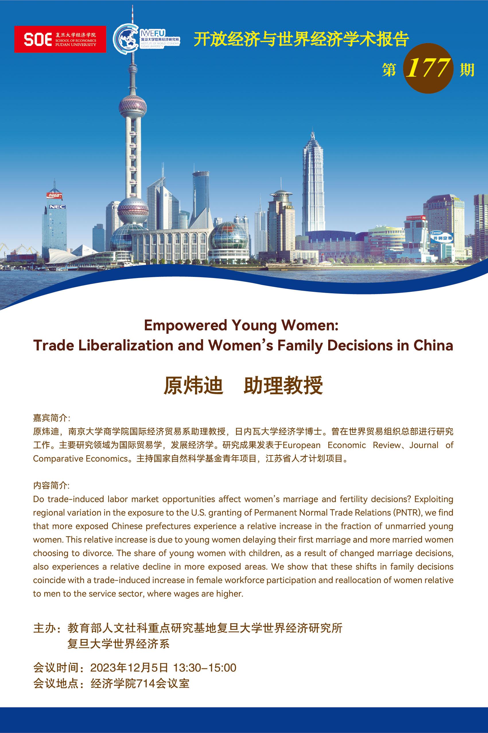 嘉宾简介: 原炜迪,南京大学商学院国际经济贸易系助理教授,日内瓦大学经济学博士。曾在世界贸易组织总部进行研究工作。主要研究领域为国际贸易学,发展经济学。研究成果发表于European Economic Review、Journal of Comparative Economics。主持国家自然科学基金青年项目,江苏省人才计划项目。