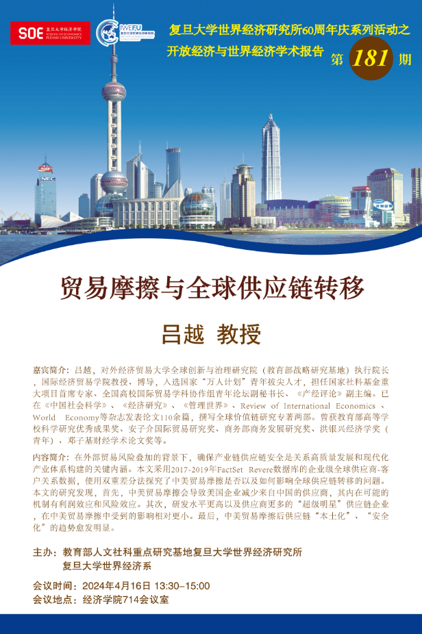 个人简介:吕越,对外经济贸易大学全球创新与治理研究院(教育部战略研究基地)执行院长,国际经济贸易学院教授、博导,入选国家“万人计划”青年拔尖人才,担任国家社科基金重大项目首席专家、全国高校国际贸易学科协作组青年论坛副秘书长、《产经评论》副主编。已在《中国社会科学》、《经济研究》、《管理世界》、Review of International Economics 、World Economy等杂志发表论文110余篇,撰写全球价值链研究专著两部。曾获教育部高等学校科学研究优秀成果奖、安子介国际贸易研究奖、商务部商务发展研究奖、洪银兴经济学奖(青年)、邓子基财经学术论文奖等。