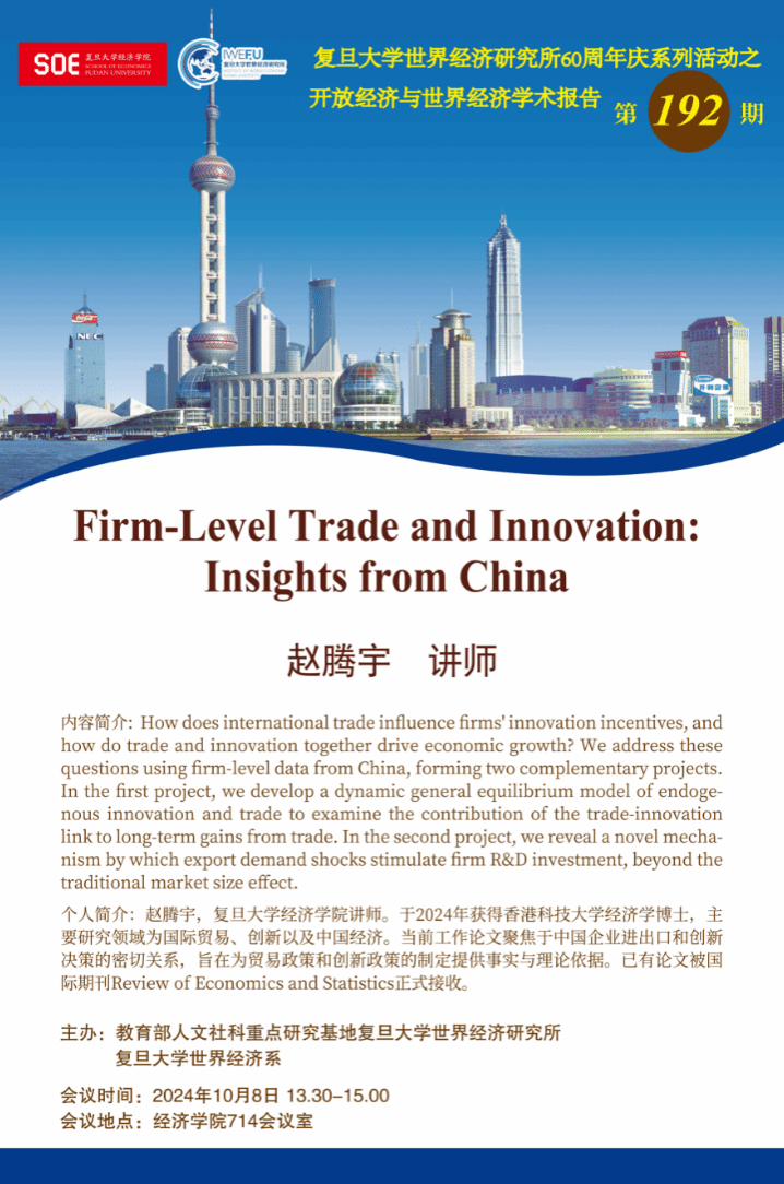 内容简介:How does international trade influence firms' innovation incentives, and how do trade and innovation together drive economic growth? We address these questions using firm-level data from China, forming two complementary projects. In the first project, we develop a dynamic general equilibrium model of endogenous innovation and trade to examine the contribution of the trade-innovation link to long-term gains from trade. In the second project, we reveal a novel mechanism by which export demand shocks stimulate firm R&D investment, beyond the traditional market size effect.