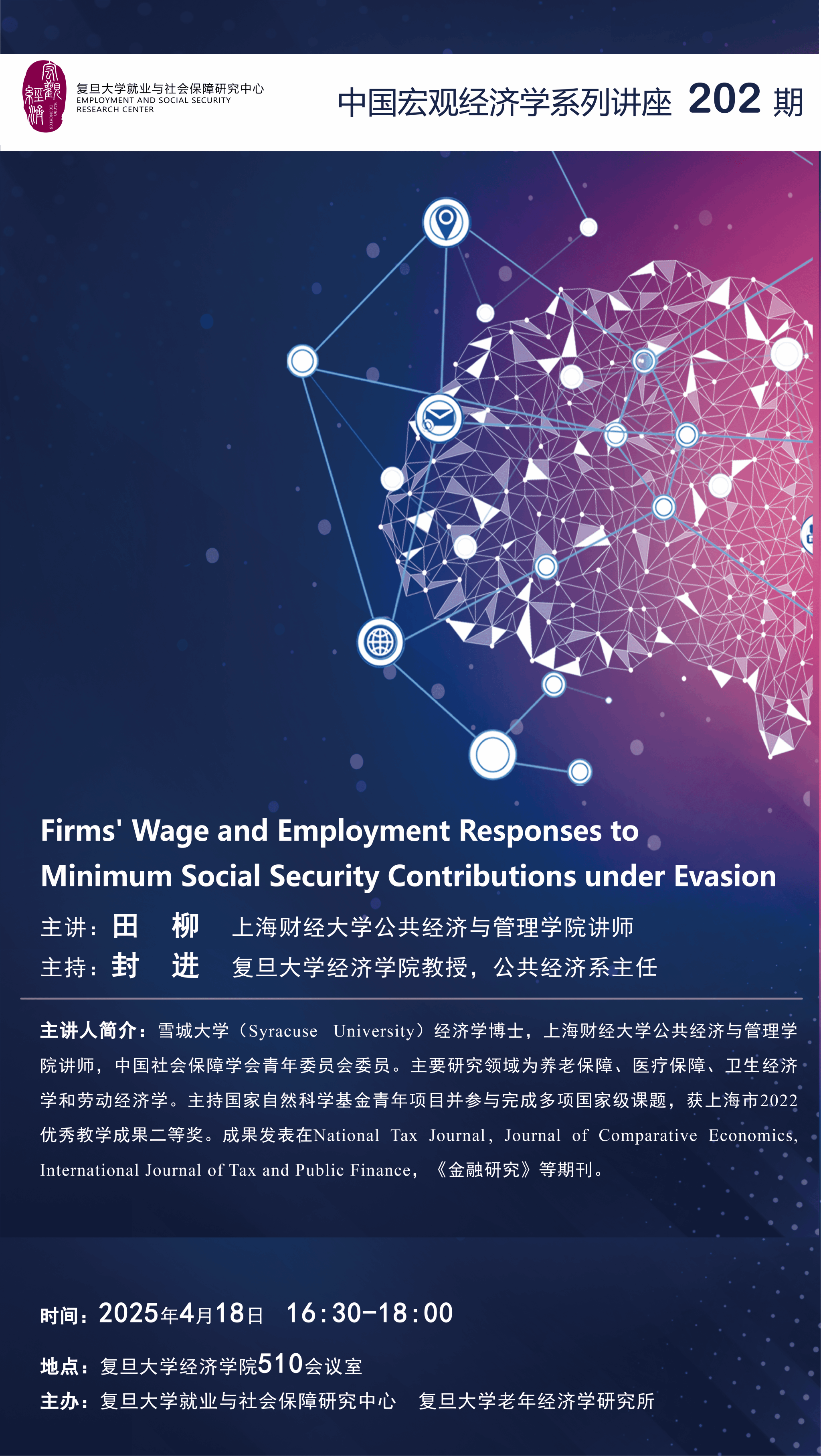 主讲:田柳,雪城大学(Syracuse University)经济学博士,上海财经大学公共经济与管理学院讲师,中国社会保障学会青年委员会委员。主要研究领域为养老保障、医疗保障、卫生经济学和劳动经济学。主持国家自然科学基金青年项目并参与完成多项国家级课题,获上海市2022优秀教学成果二等奖。其研究成果发表在National Tax Journal,Journal of Comparative Economics, International Journal of Tax and Public Finance,《金融研究》等学术期刊。