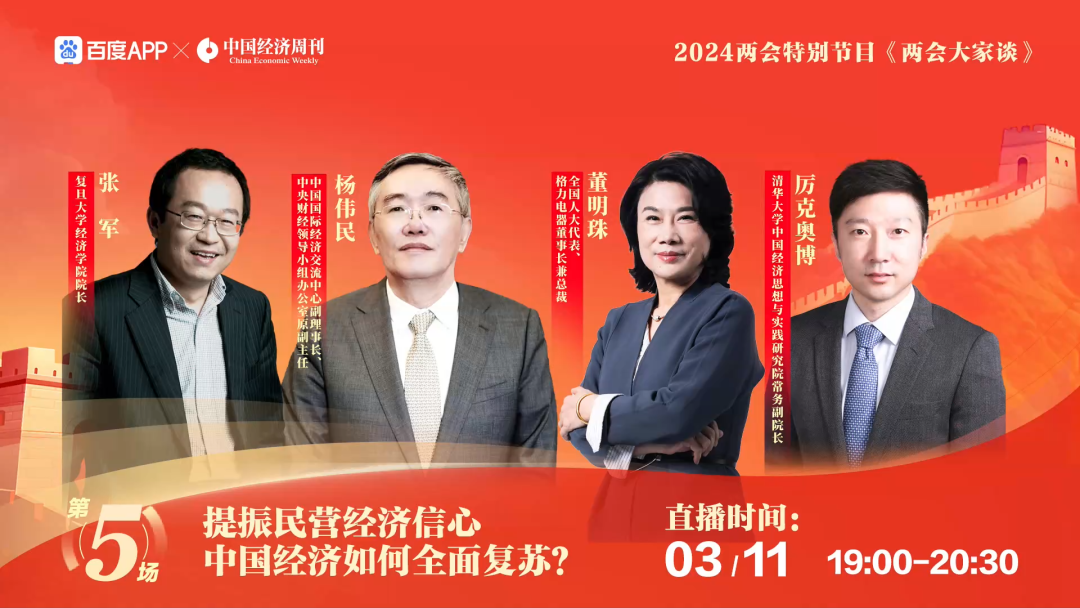 2024年全国两会期间,中国经济周刊联合百度APP,邀请代表委员、学者型官员、商界领袖、经济学家、行业专家,推出《两会大家谈》系列直播,旨在通过专业的探讨,分析现象背后的本质。3月11日的第五场直播关注民营经济话题:今年中国经济的增长目标定为5%左右,要想达到5%左右的经济增速,可能会面临哪些困难,应该如何应对,如何突破经济的内部约束?民营企业家“出海”有何经验可循?新质生产力的提高将对就业和消费产生哪些影响?无码流出