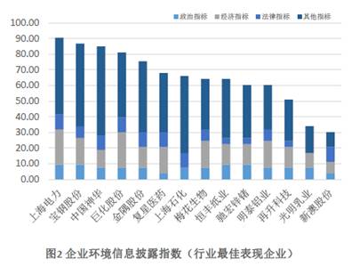 行业中最佳企业得分位居前三的分别是火电产业(表现最佳企业是“上海电力”,得分为90.57分),钢铁产业(表现最佳企业是“宝钢股份”,得分为86.79分)与煤炭产业(表现最佳企业是“中国神华”,得分为84.9分),后三位的则是建材产业(表现最佳企业是“再升科技”,得分为50.94分)、酿造产业(表现最佳企业是“光明乳业”,得分为33.96分)和纺织产业(表现最佳企业是“新澳股份”,得分为30.19分)。与行业平均得分的分布呈现较为密集的特征相比,行业中最佳企业得分前三位得分超过后三位得分1倍多,这充分表明,在企业环境信息披露的表现上,不同行业的最佳表现企业之间呈现较为分散的特征。