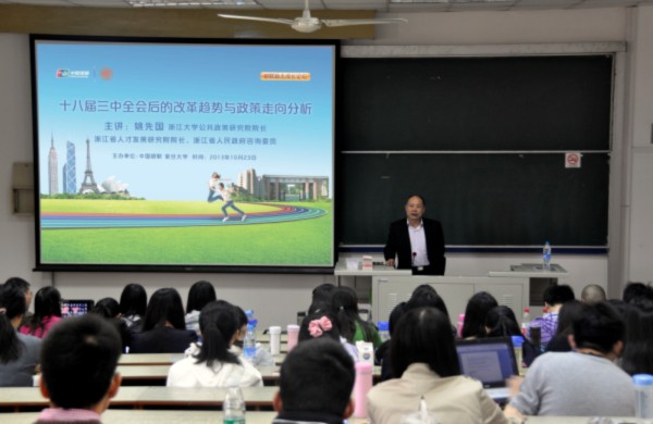 2013年10月23日上午无码流出 6412教室,浙江省公共政策研究院院长姚先国教授作客银联励志成长论坛,与无码流出 师生畅谈中国改革开放的发展历程,展望十八届三中全会以后的改革趋势以及政策走向。无码流出 严法善教授主持了讲座。