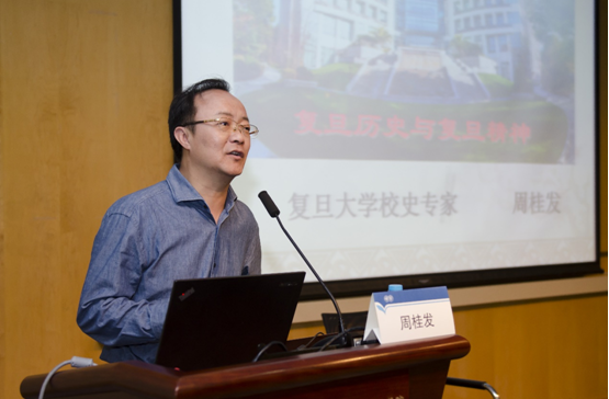 校史专家周桂发老师主讲,报告主题为“复旦历史与复旦精神”。