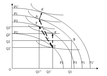 同学们深入了解企业家精神之后,黄老师将企业家精神置于中国经济发展的大背景之下,阐释了中国经济改革与企业家精神的生产性发挥之间的关系。直到改革初期,家庭联产承包责任制、价格双轨制等变通性制度逐渐确立,企业家精神才得以发挥。这一时期,企业家精神的生产性发挥对中国经济发展具有重要的促进作用,主要表现在三个方面:一是企业自发的制度创新,如新型的企业组织、合约执行机制、资本获取方式等;二是企业不断发现利用市场机会,优化资源配置;三是技术进步,包括经济转型后期的高新技术引进和私营企业自身的技术创新等。为了让同学们从经济学的角度更好地理解企业家精神在中国经济改革中的发挥,黄老师通过生产可能性边界地推移与最佳生产组合的变动来刻画这一过程。黄老师认为,最佳生产组合从较低效用的C点移动到较高效用的A’点,离不开熊彼特型企业家与柯兹纳型企业家的配合。熊彼特型企业家创造新的更高水平的生产可能性边界,而柯兹纳型企业家则在新的生产水平下推动最优组合的实现,二者缺一不可。