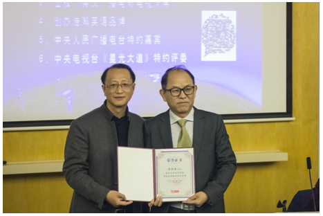 (严立新副教授向李洪涛教授授予学院职业校外指导教师荣誉证书)