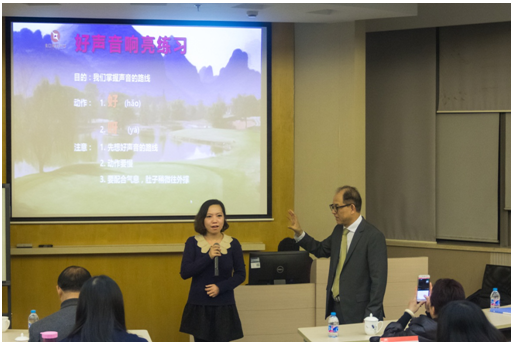 在严立新老师一番幽默风趣的开场白介绍后,李教授开始给同学们传授如何利用自己的普通嗓子,发出“金嗓子”般的好声音。李教授以朗诵毛泽东的诗词《沁园春•雪》开始,用他抑扬顿挫、浑厚宽广的声音,将这首词演绎极富有画面感和情调,赢得现场同学的阵阵掌声。