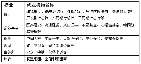 据目前不完全统计,今年我院专业学位毕业生就业去向保持了国际化、多元化、专业化的特点,就业行业包括银行、证券、保险、基金、资产管理、四大、信托、咨询等。全部同学均将加入核心岗位,成为有关行业、机构发展创新的重要新生力量。